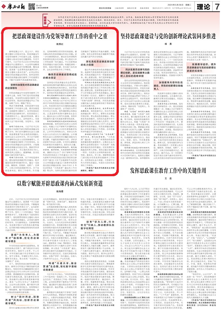今年是習(xí)近平總書記主持召開學(xué)校思想政治理論課教師座談會(huì)五周年。五年來,各級各類學(xué)校深入學(xué)習(xí)貫徹習(xí)近平總書記重要講話精神,思政課發(fā)展環(huán)境和整體生態(tài)發(fā)生全局性、根本性轉(zhuǎn)變。近日,習(xí)近平總書記作出重要指示強(qiáng)調(diào),不斷開創(chuàng)新時(shí)代思政教育新局面,努力培養(yǎng)更多讓黨放心、愛國奉獻(xiàn)、擔(dān)當(dāng)民族復(fù)興重任的時(shí)代新人。本期理論版刊發(fā)廣西大學(xué)馬克思主義學(xué)院四位專家學(xué)者的文章,分享大思政教育的理論創(chuàng)新和實(shí)踐探索成果。