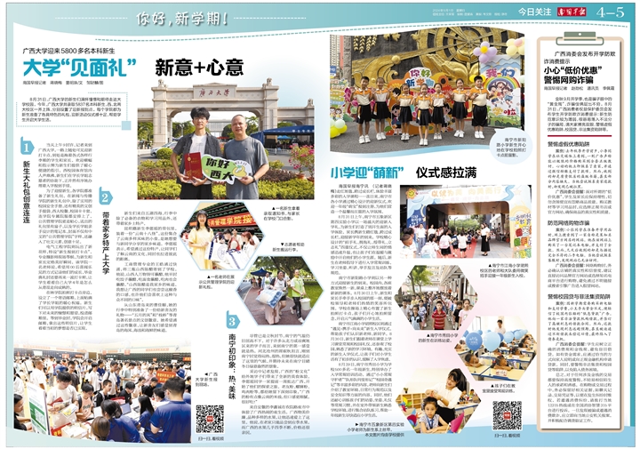 8月31日,廣西大學的新生們滿懷憧憬和期待走進大學校園。今年,廣西大學共錄取5837名本科新生,西、北兩大校區一齊上陣,分別設置了迎新報到點。每個學院都為新生準備了各具特色的禮包,迎新活動儀式感十足,幫助學生開啟大學生活。