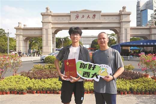 當天上午9時許,記者來到廣西大學,一路上隨處可見迎新打卡點,到處是拖著各式各樣行李箱的學生和家長。歡迎橫幅和指示牌為新生們提供了暖心便捷的指引。西校園體育館內人聲鼎沸,新生們在學長學姐志愿者的協助下,正井然有序地辦理著入學報到手續。