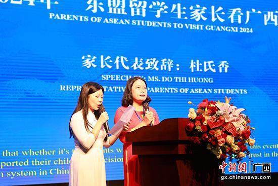 留學生家長代表杜氏香分享了女兒本科期間在中國學習、生活的點滴經歷,表達了對廣西教育環境的高度認可,和對未來中國與東盟國家教育合作的期待與信心。