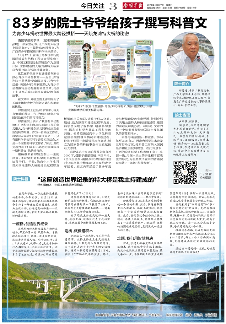 我是鄭皆連,一位熱愛橋梁建設的老爺爺,今年83歲。11月12日,在瑞士蘇黎世,國際橋梁與結構工程協會舉行了一場盛大的頒獎典禮,我作為總設計師,主持建成的橋梁——天峨龍灘特大橋,榮獲大型公路與鐵路橋的最高獎。