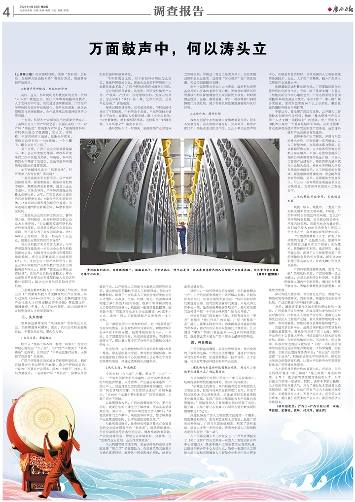 當前,廣西成立由自治區黨政主要領導為組長的人工智能發展工作專班,實施中國工程院戰略咨詢項目《面向東盟的廣西人工智能應用戰略研究》,優化頂層規劃設計。政府部門、高校、企業等紛紛開始行動,布局“人工智能+”。自治區工信廳提出,力爭到2027年形成100個標志性智能產品,打造100個人工智能典型應用場景;自治區科技廳聚焦林業、糖業、工程機械、有色金屬、交通物流、口岸貿易等,啟動一批人工智能行業垂直領域應用研發項目,力爭培育2—3個有全國競爭力的行業大模型;并實施賦能行動,聚焦典型應用場景,支持一批大模型示范應用項目。