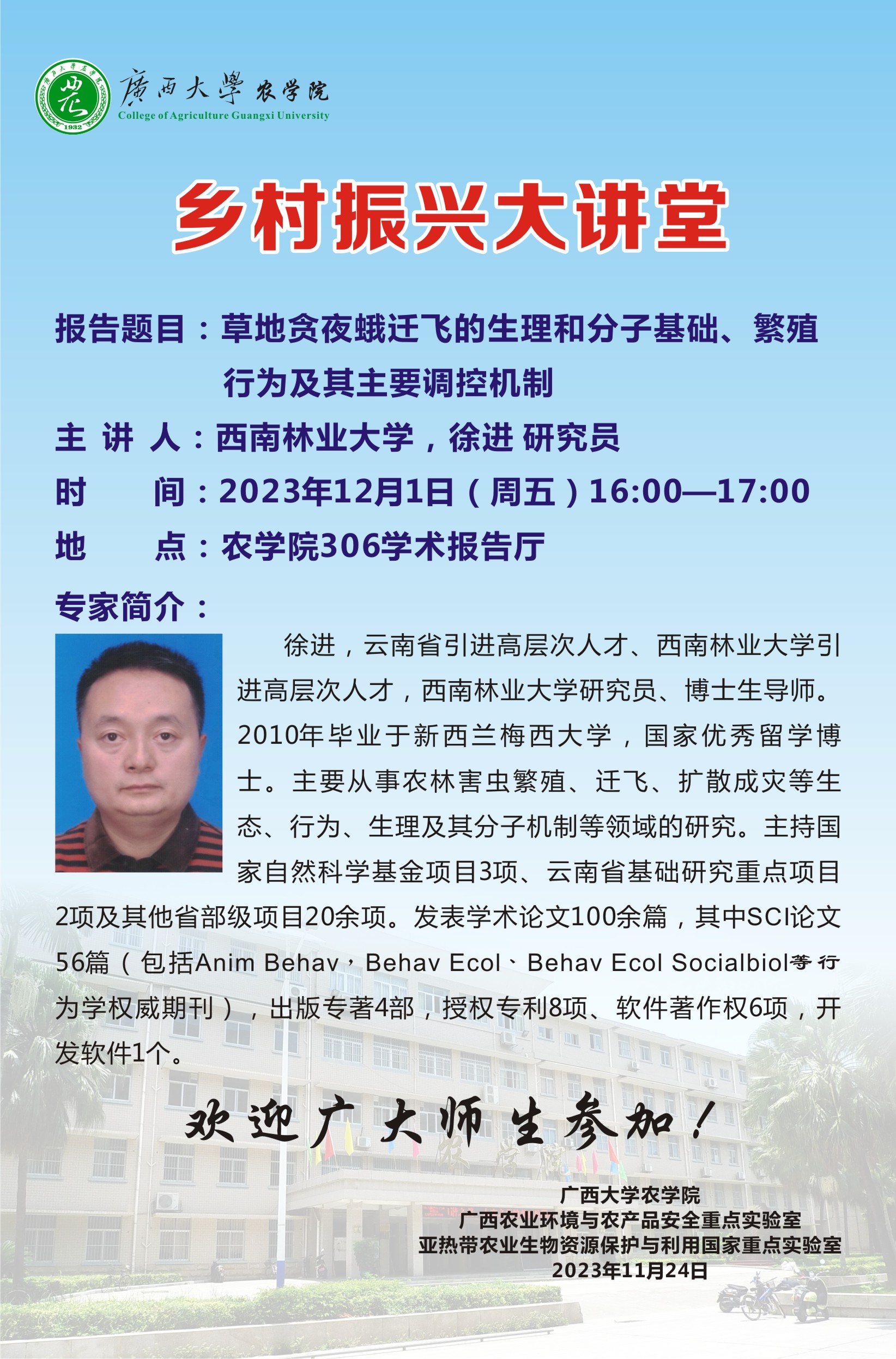 上一條:鄉(xiāng)村振興大講堂:化學(xué)信息物質(zhì)介導(dǎo)的蟲菌共生入侵機(jī)制、應(yīng)用與學(xué)說