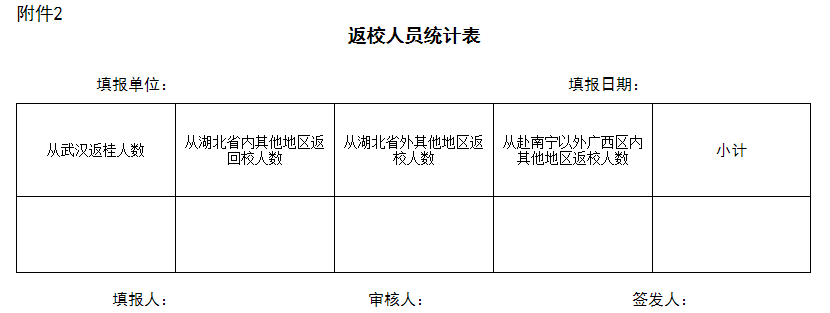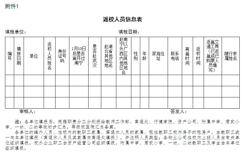 四、再次重申現(xiàn)在湖北境內(nèi)的和近兩周內(nèi)有湖北等地接觸史或有與確診、疑似病例接觸史的教職工及其親屬,暫時(shí)不要返校,返回時(shí)間等候?qū)W校進(jìn)一步通知。學(xué)校教職員工及其親屬目前不在南寧的,如返校,需向本單位主要負(fù)責(zé)人報(bào)備,填報(bào)返校信息表。各單位每天需將該信息表與疫情情況一同上報(bào),由校醫(yī)院統(tǒng)一匯總備案。