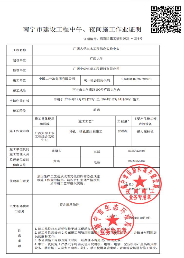 我單位承建的廣西大學土木工程綜合實驗中心項目因施工工藝需要,在符合法律許可的夜間施工條件之下,經南寧市住房和城鄉建設局、南寧市生態環境局核準,計劃于2024年12月12日22:00—2024年12月14日6:00進行靜壓樁施工。我單位將嚴格按照建設局、環保局要求,采取有效措施盡可能減少影響。施工期間可能會對廣大師生員工的日常生活造成一定的干擾。對此,我們深表歉意,敬請諒解。